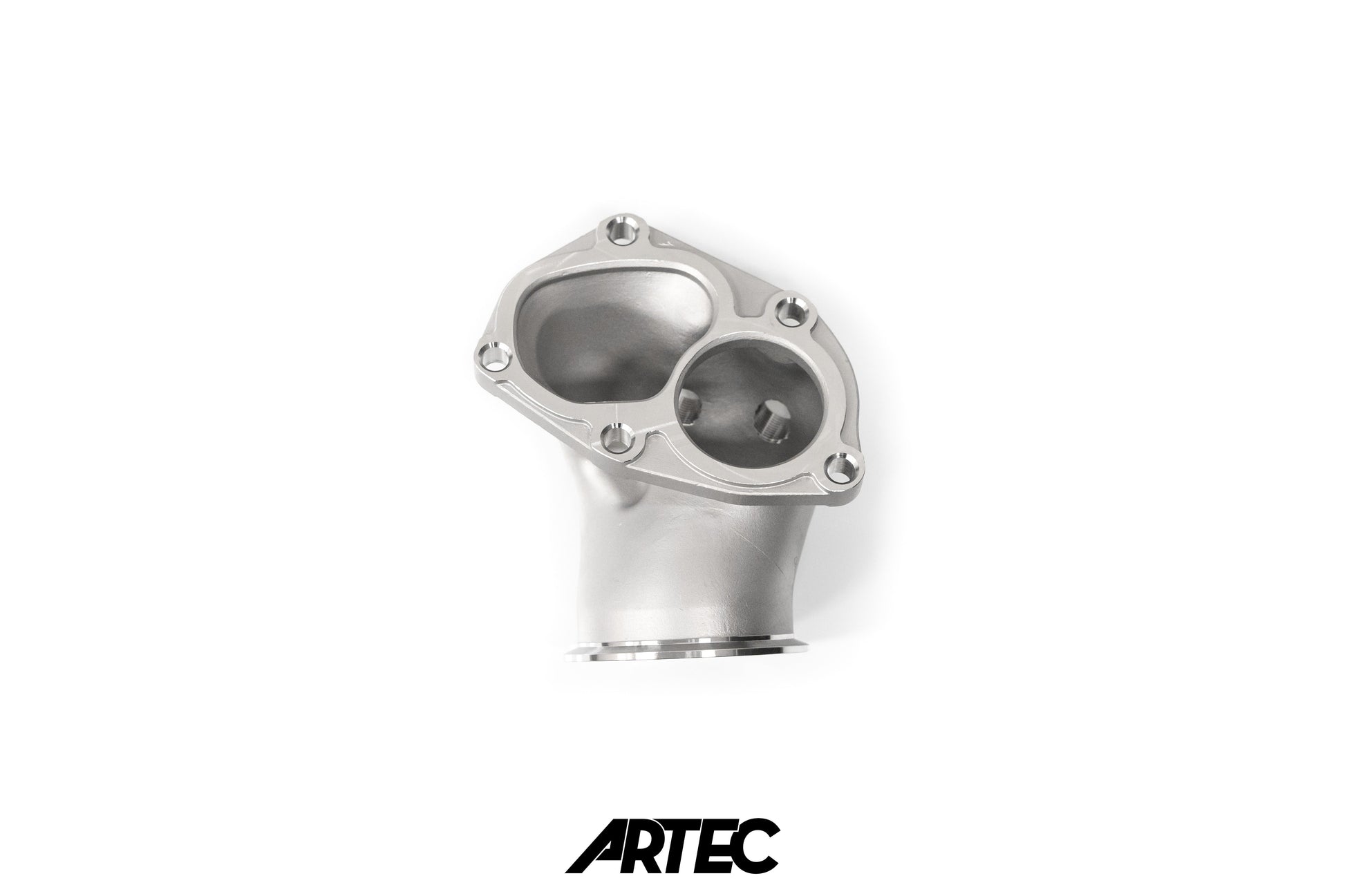 This is why we developed the ARTEC 3.5” Cast Outlet. We use a 3.5” V-Band on the outlet side for simple installation, as well as including a second 02 sensor mount for people wanting to run a wide band sensor without having to take parts off later and weld bits on which can quickly add up the cost.